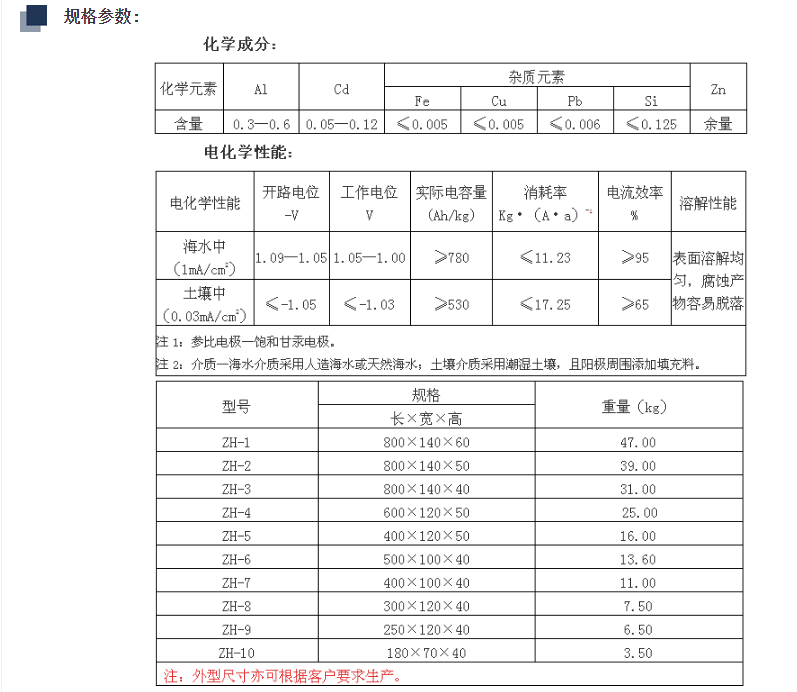 我公司生產的鋅合金犧牲陽極采用優良的原材料,成熟的生產工藝,先進的儀器檢驗,確保每支陽極符合國標要求。